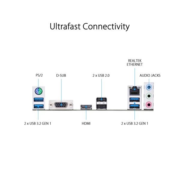 Back I/O Ports | 1 x PS/2 keyboard/mouse combo port(s) 1 x D-Sub 1 x HDMI 1 x LAN (RJ45) port(s) 4 x USB 3.2 Gen 1 (blue) Type-A 2 x USB 2.0 3 x Audio jack(s) |