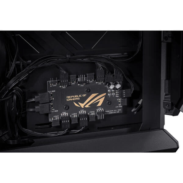 No ROG chassis is complete these days without a built-in hub to control fans and ARGB lighting. This one is emblazoned with a gold ROG logo, and it supports up to eight ARGB components and six PWM fans, so users can add their own illumination and cooling in addition to the lighting board and four case fans already attached.