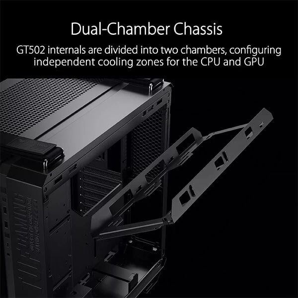Asus GT502 internals are divided into two chambers, allowing you to build clean and configure independent cooling zones for the CPU and GPU. Freely expand your rig and give system components the ideal environment to dish out frames and slice through workloads.