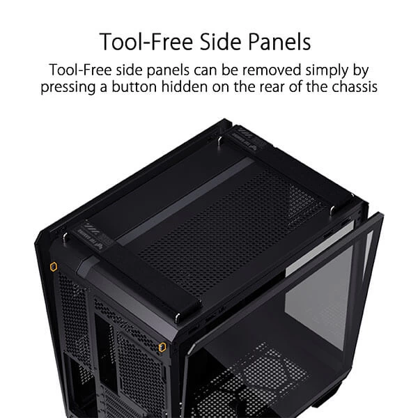 The TUF Gaming GT502 continues its builder optimizations with side panels that can be removed simply by pressing a button hidden on the rear of the chassis.