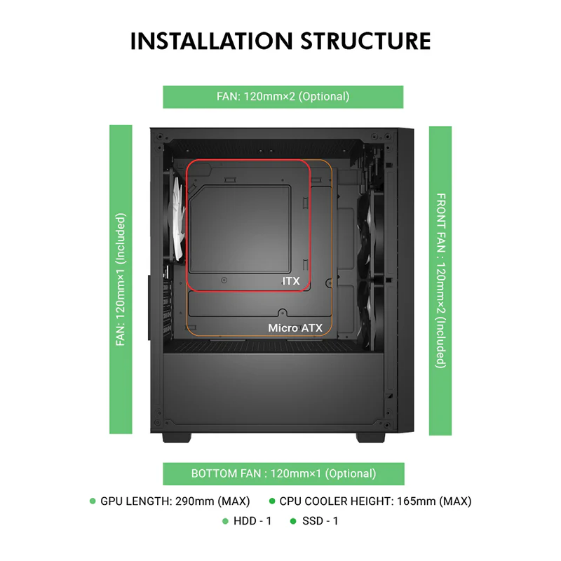 - Supports full-length GPUs (up to 340mm) and tall CPU coolers (up to 165mm).