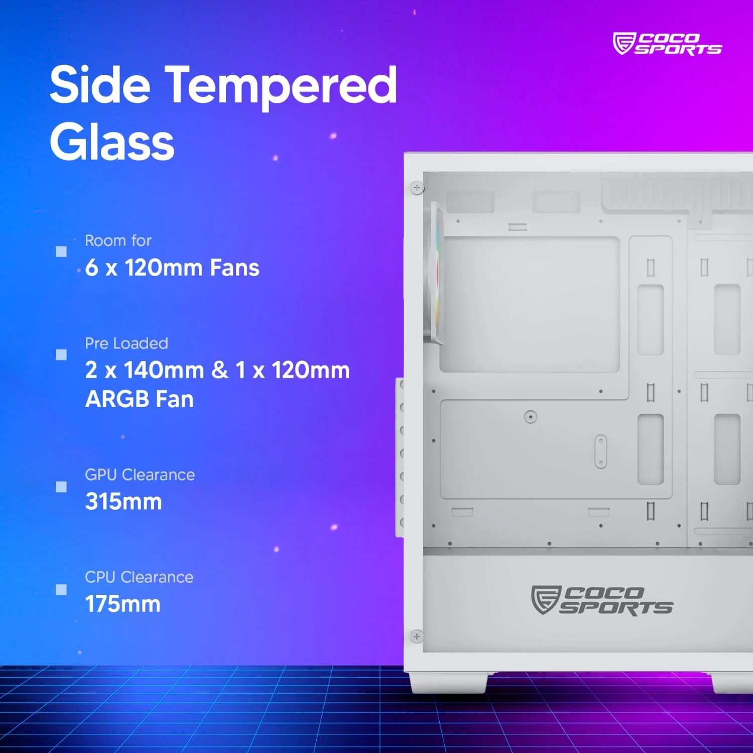 - VGA Clearance: 315mm, CPU Cooler Clearance: 175mm, Power Supply Support: 180mm