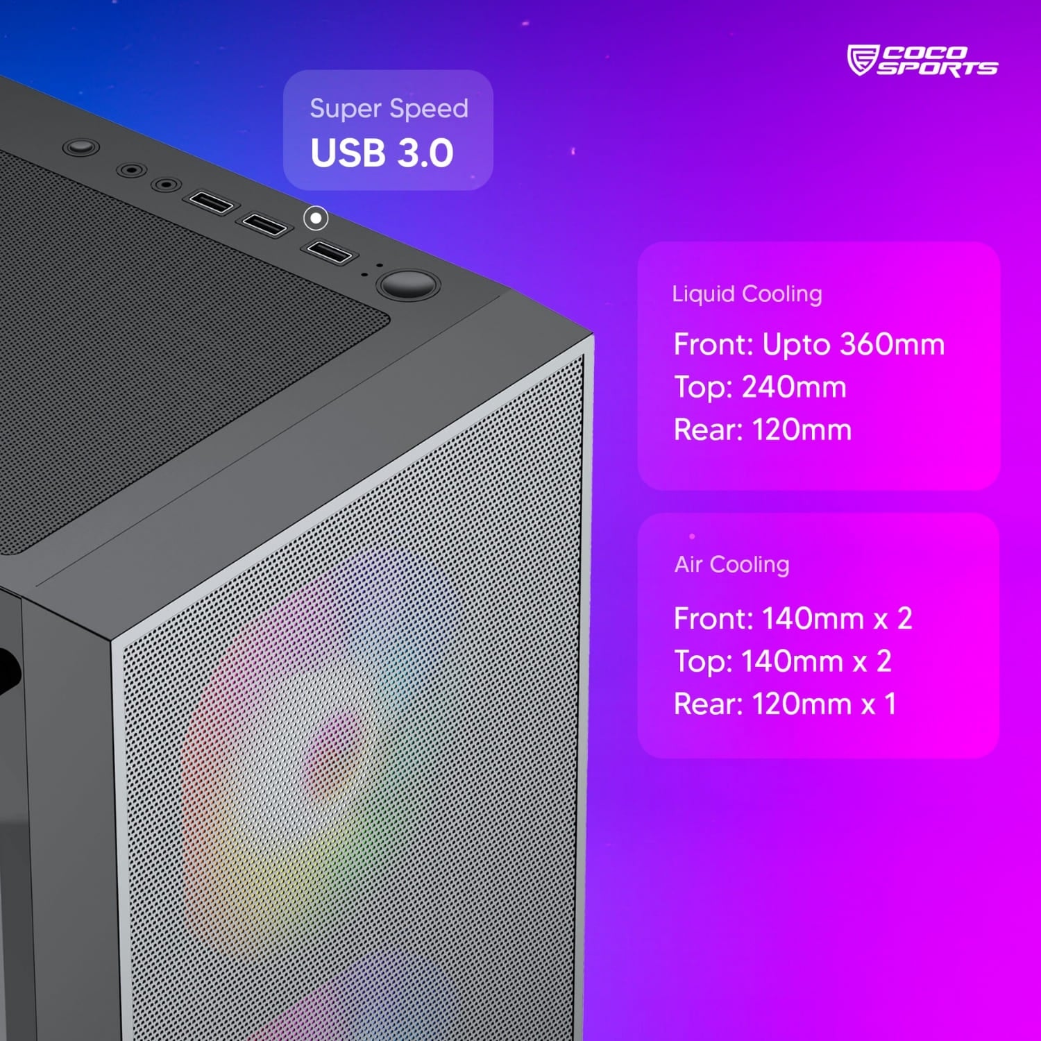 - coconut Air Cooling -Front: 140mm x 2 (Max.), Top: 140mm x 2 (Max.), Rear: 120mm x 1 (Max.)