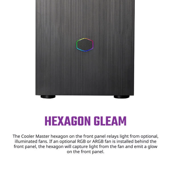 The Cooler Master hexagon on the front panel relays light from optional, illuminated fans. If an optional RGB or ARGB fan is installed behind the front panel, the hexagon will capture light from the fan and emit a glow on the front panel.