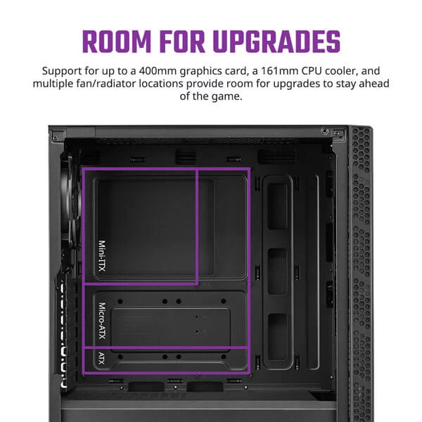 Support for up to a 400mm graphics card, a 161mm CPU cooler, and multiple fan/radiator locations provide room for upgrades to stay ahead of the game.