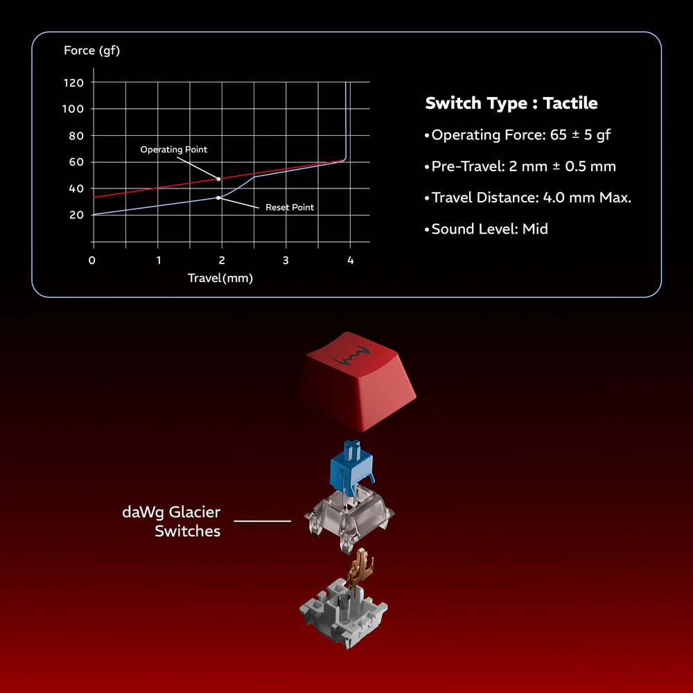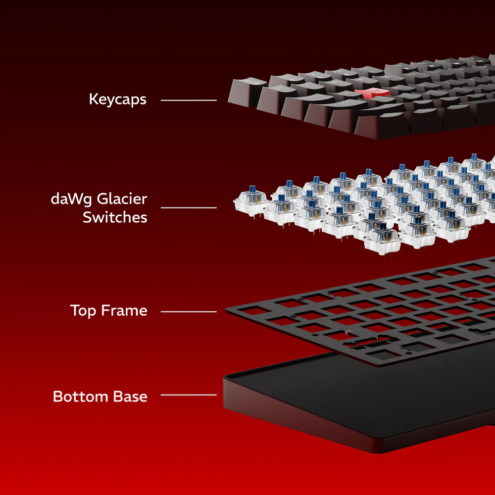 - Switches & Feel: Uses daWg Glacier blue switches, pre-lubed for smoother tactile feedback