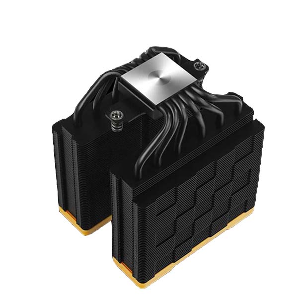 The same premium-quality materials, featuring six advanced copper heat pipes, a pure copper coldplate, a dense dual-tower heat sink, and two silent FDB fans, produce a powerful winning formula for high-performance cooling in a raven black and yellow aesthetic.