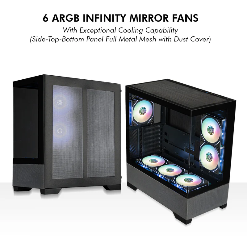- The Defender ZX9 – BTF (Black) from Circle Gaming is a feature-rich mid-tower PC case designed for gamers, boasting an Infinity Mirror front panel for stunning ARGB lighting, support for large hardware (long GPUs, high CPU coolers, 360mm radiators), excellent airflow with pre-installed ARGB fans, versatile storage, and convenient cable management, all wrapped in a sleek black design with tempered glass for showcasing components.