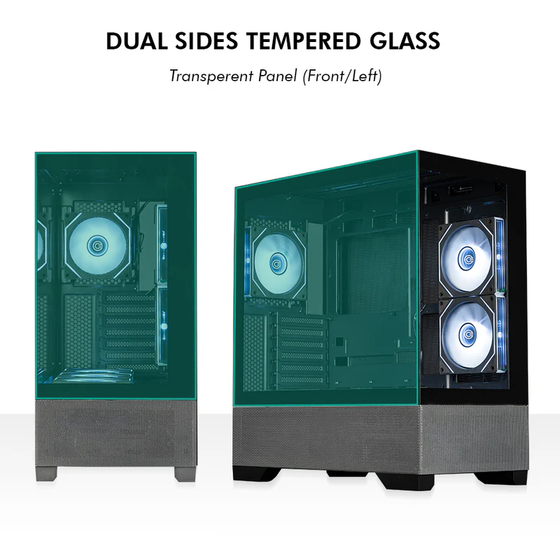 - Tempered Glass: Panoramic or dual-panel tempered glass for a clear view of internal hardware.