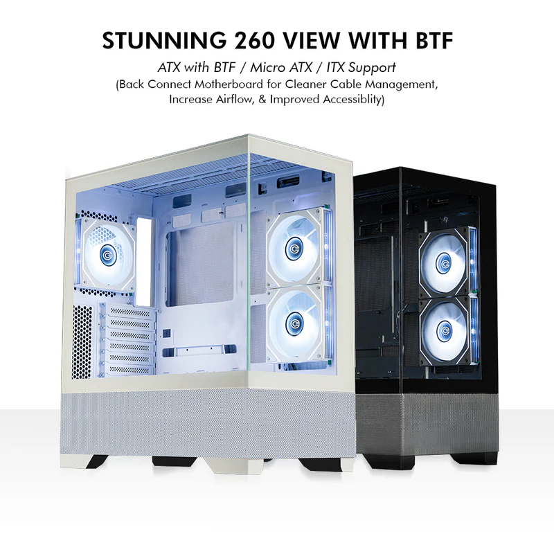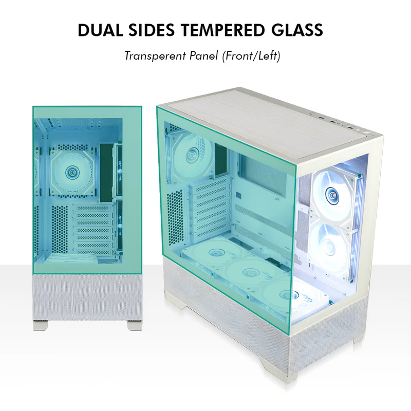 - Design: Dual tempered glass panels for 270° view, BTF compatibility for reverse connectors.