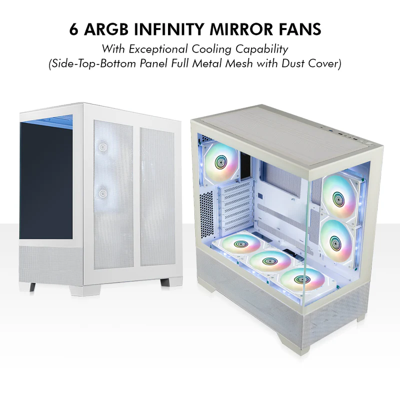| Cooling Support | Multiple ARGB fans included, Supports up to 360mm radiator at top |