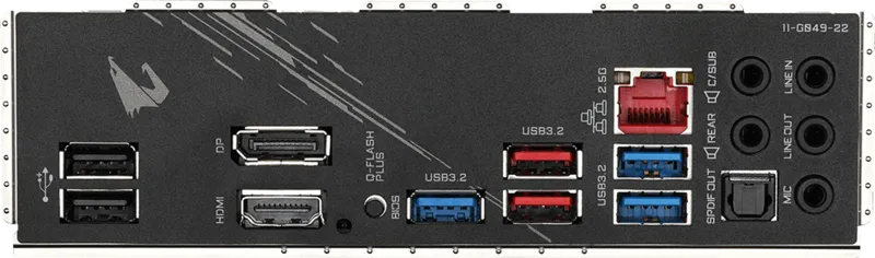 | Back Panel Connectors | 1 x DisplayPort 1 x HDMI port 2 x USB 3.2 Gen 2 Type-A*/USB 3.2 Gen 1 ports (red) *For AMD Ryzen™ 5000 Series/3000 Series Processors only. 3 x USB 3.2 Gen 1 ports 2 x USB 2.0/1.1 ports 1 x Q-Flash Plus button 1 x RJ-45 port (2.5GbE LAN) 1 x optical S/PDIF Out connector 5 x audio jacks |