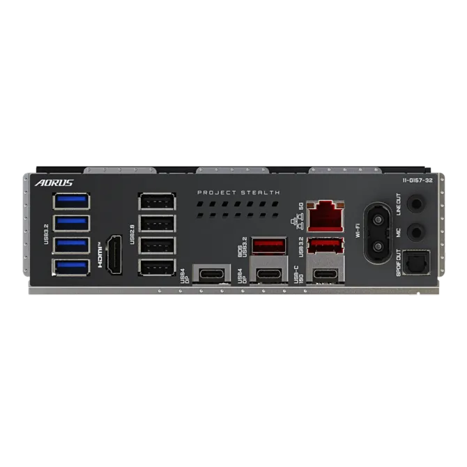| Back Panel Connectors | 1 x HDMI port (Note) 1 x reset button 1 x power button 1 x Clear CMOS button 1 x Q-Flash Plus button 5 x USB 3.2 Gen 2 Type-A ports (red) 2 x USB Type-C® ports, with USB 3.2 Gen 2 support 2 x USB4® USB Type-C® ports (DisplayPort (Note)) 1 x RJ-45 port 3 x USB 3.2 Gen 1 ports 2 x antenna connectors (2T2R) 2 x audio jacks 1 x optical S/PDIF Out connector (Note) Actual support may vary by CPU. |