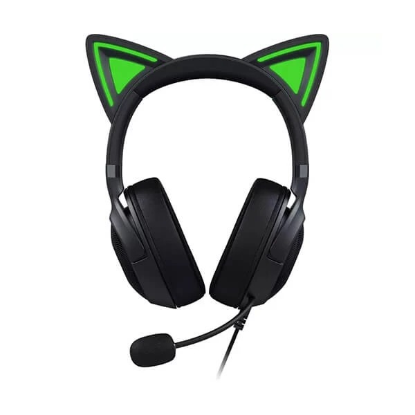 Razer Kraken Kitty V2 black color with a Razer Chroma RGB headset featuring 3 interchangeable ear designs, stream reactive lighting for next-level audience engagement, and a solid mic for crystal-clear voice capture.