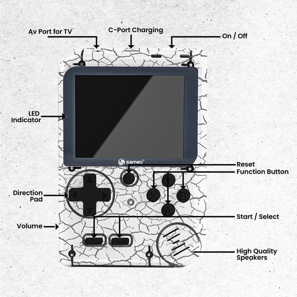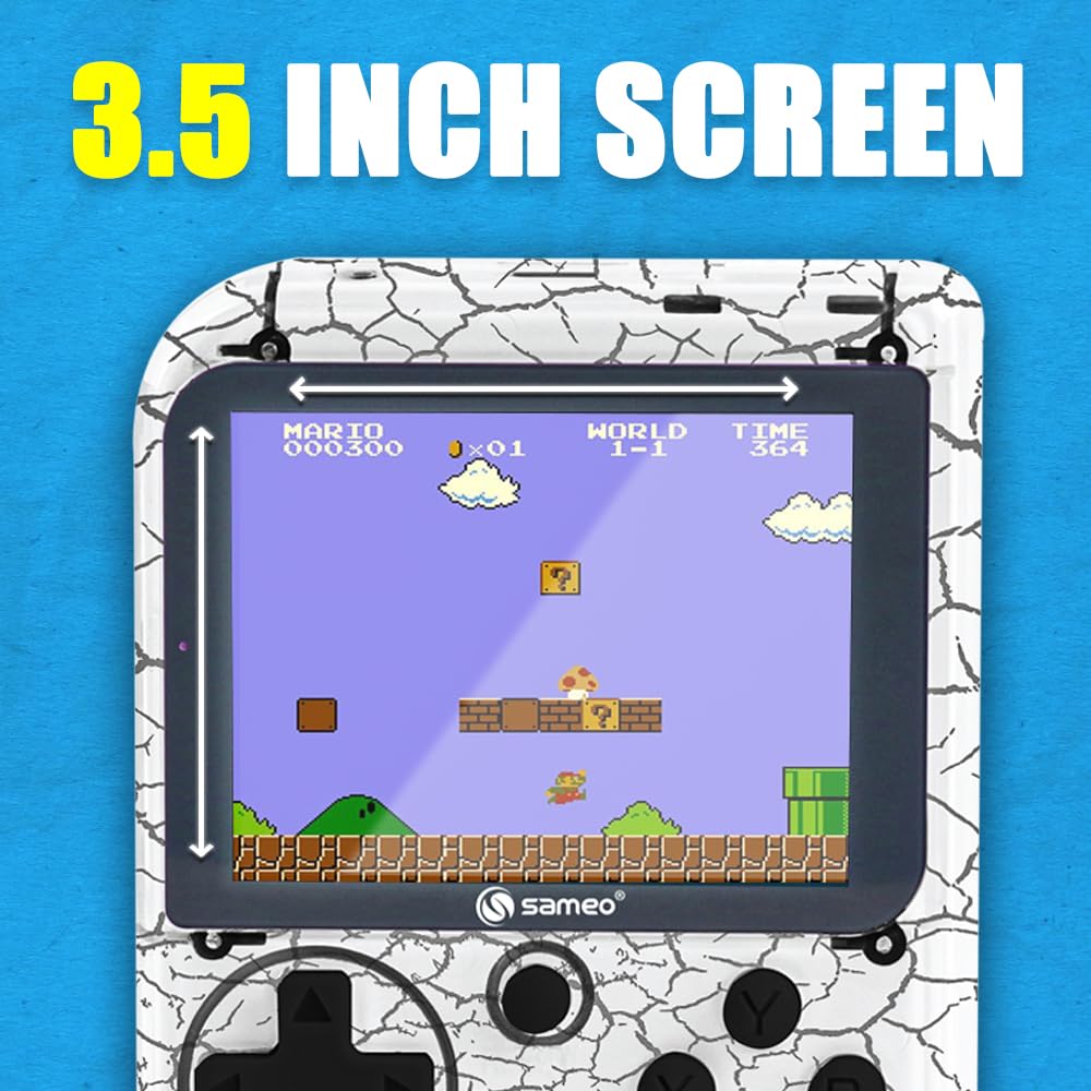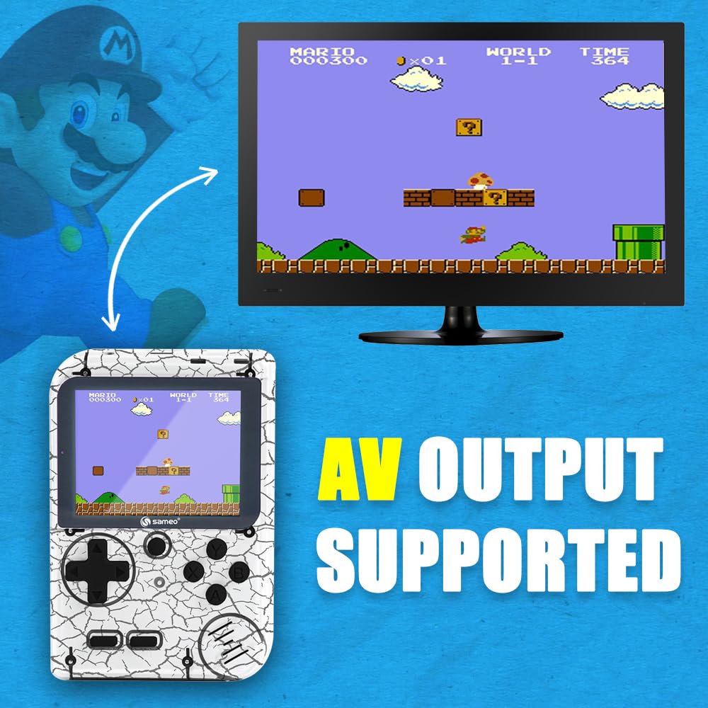 - Sameo Built-in 500 Classical Games: It’s a good gift for your children, friends, both boys and girls will like it. Adapted AV Cable: Applicable to TV system, so that you can easily enjoy vivid and exciting games on a big screen.