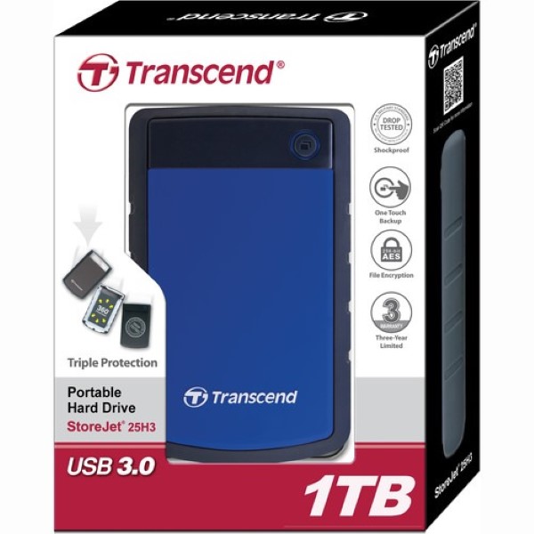 Incredible Ultra High SpeedsThe StoreJet 25H3B USB 3.0 portable hard drive is equipped with the next-generation SuperSpeed USB 3.0 interface that provides transfer speeds at least 3X faster than USB 2.0 models. Thanks to the improved bandwidth of USB 3.0, the StoreJet 25H3B makes file sharing easier and quicker than ever with real-world transfer speeds of up to 90MB/s. | Military-Grade Shock ResistanceCompact, durable and reliable, the StoreJet 25H3B rugged external hard drive is shielded by an advanced three-stage shock protection system to withstand even the toughest user environment. The royal blue outer shell is made of a slip-resistant silicone material, reinforced by a hard casing and an internal hard drive suspension damper – all designed to reduce forces of impact and provide maximum shock-absorption. | One Touch Auto-Backup ButtonThe StoreJet 25H3B is equipped with an extremely convenient One Touch auto-backup button for instant data backup and synchronization when used with Transcend Elite software. Additionally, using the StoreJet 25H3B on your computer couldn’t be easier. Simply connect the drive to a SuperSpeed USB 3.0 port and drag and drop desired files to and from the device. The StoreJet 25H3B supports Microsoft Windows 8/7/Vista/XP, Mac OS X, and Linux systems, and is backwards compatible with USB 2.0 ports. |
